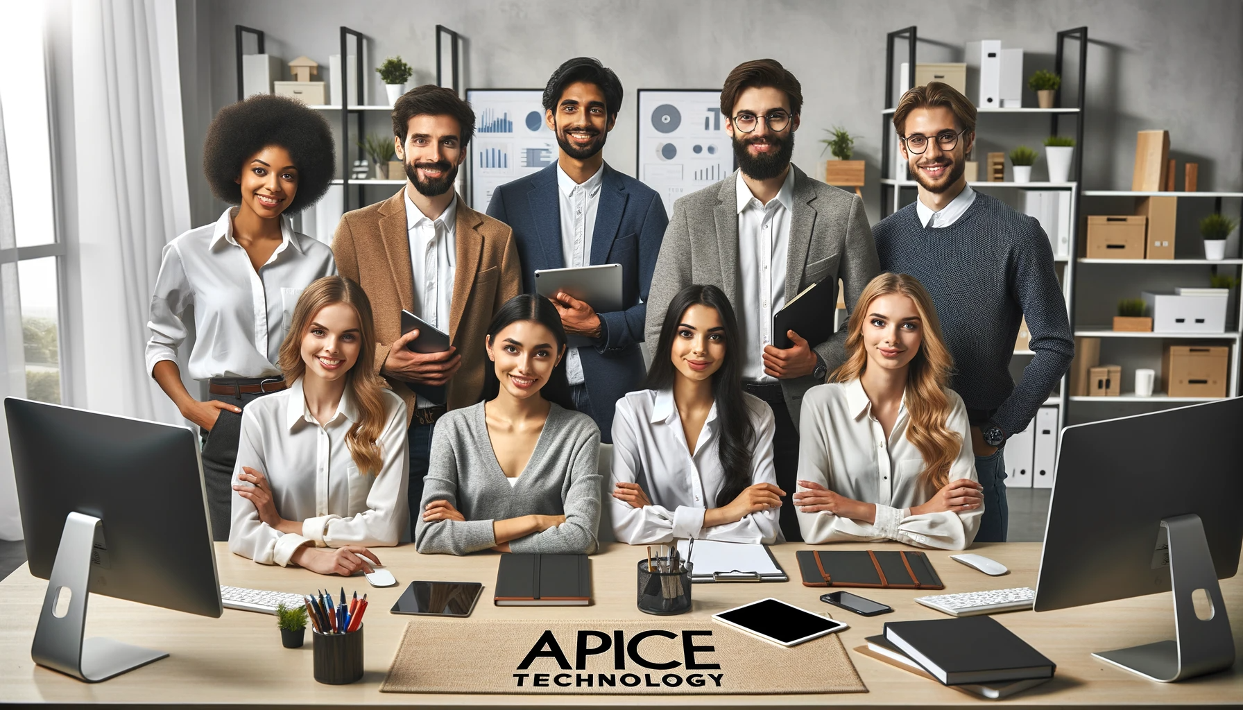 A group photo of exactly five employees at 'Apice Technology', with three women and two men, in a clean and organized IT office setting. Each person is holding an item related to their work: pens, tablets, smartphones, and folders. The team is diverse, representing Caucasian, Hispanic, Black, Middle-Eastern, and South Asian descents. They are smiling and dressed in smart casual attire, creating a professional and friendly atmosphere. The office is modern with tidy desks and high-tech equipment. Below the image, display the company name 'Apice Technology' in a stylish, modern font, emphasizing the company's contemporary and inclusive culture.